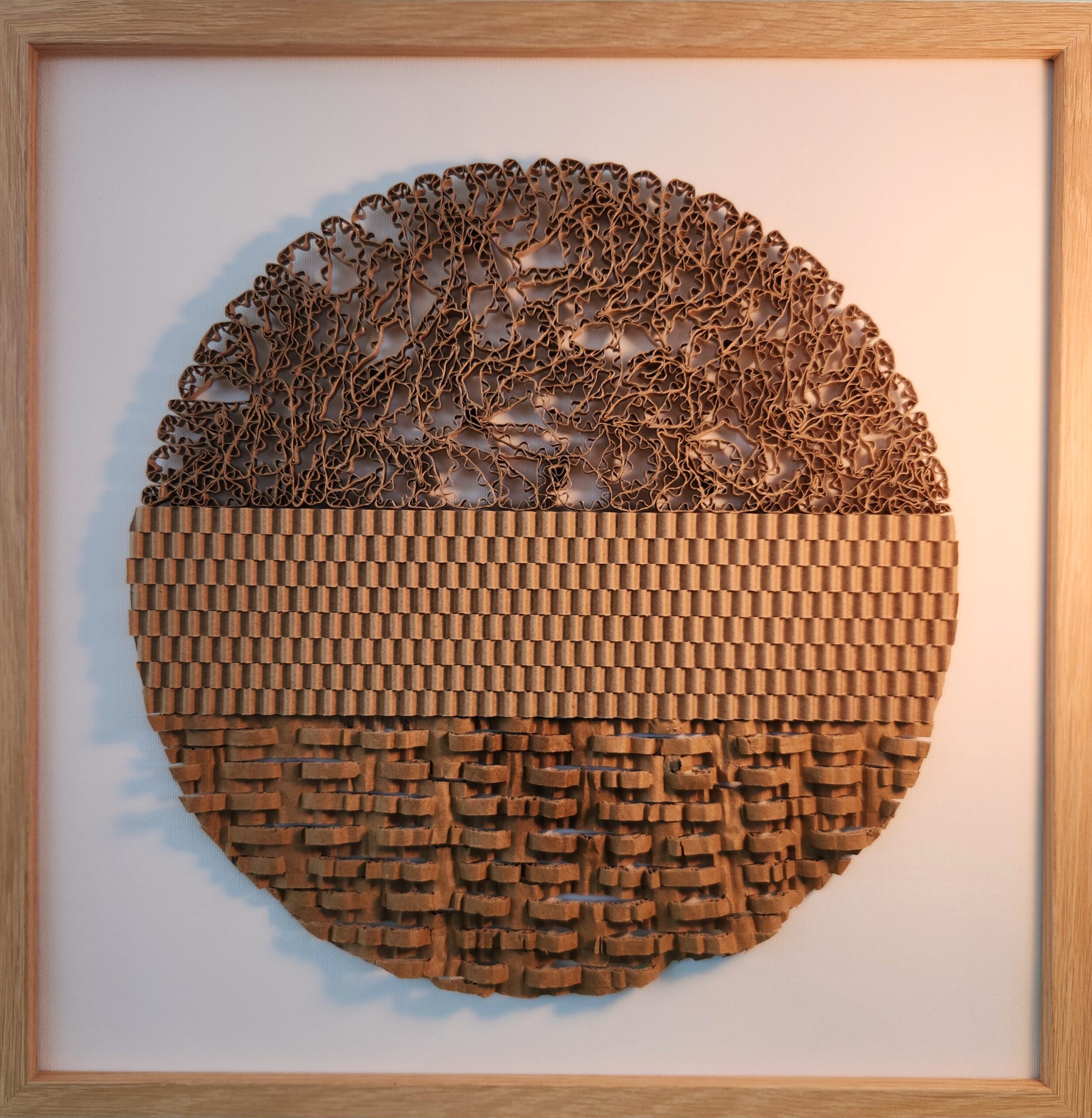 Anderson’s tactile, reclaimed-cardboard relief lets land-memory breathe through shifting light.
