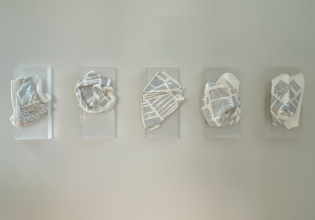 Borden’s incisive, sculpted polyptych refracts truth through distortion and glossy illusion.