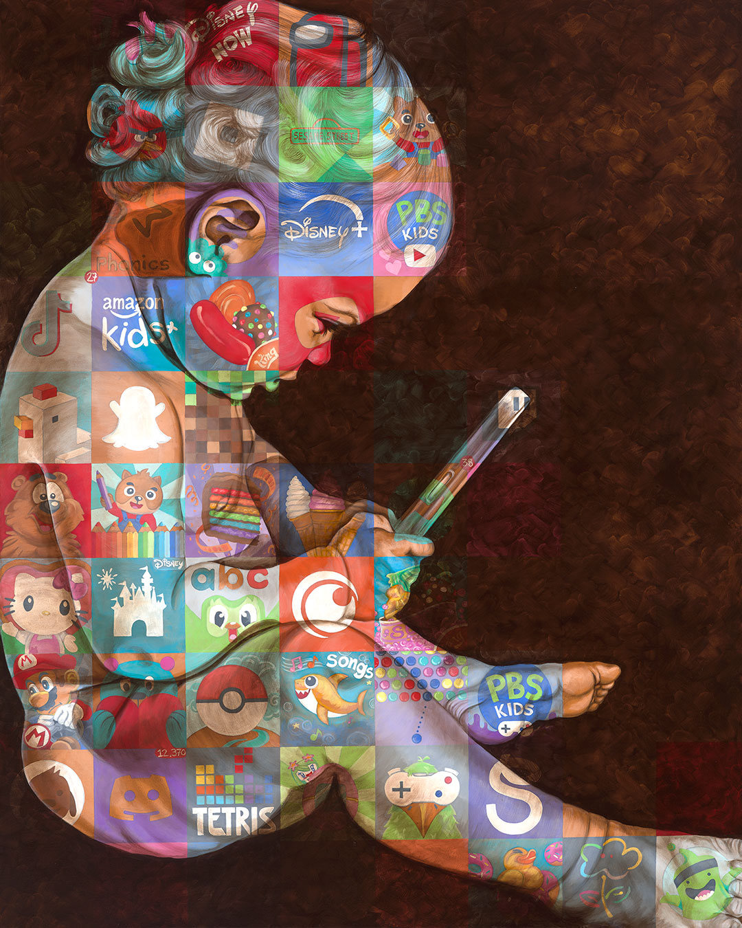 In her ongoing Dopamine series, Spear overlays meticulously rendered oil portraits with grids of app icons and corporate tech logos, echoing the familiar structure of a smartphone’s home screen. This visual language speaks to the ubiquity of digital culture and the subtle ways it has become embedded in our physical and emotional lives.