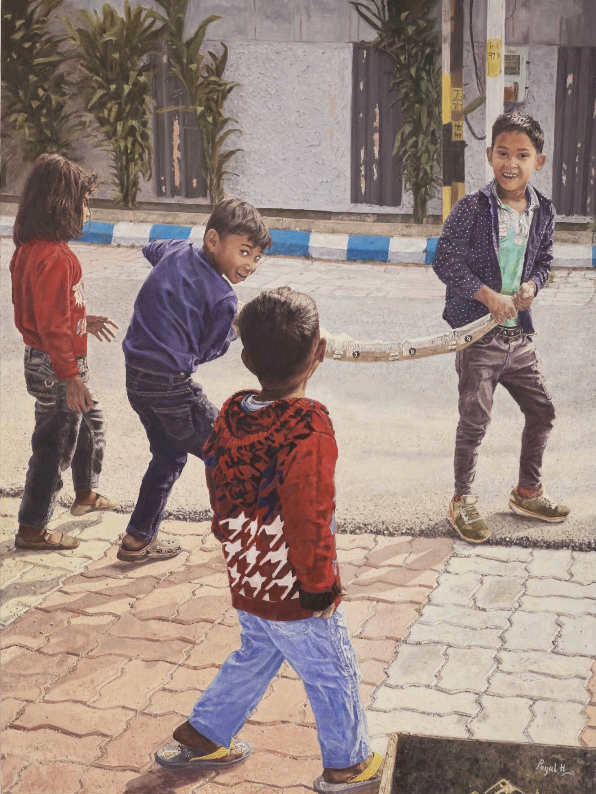 Artist’s Statement: I was returning from my morning run, when I saw some young kids playing by the kerb. They had filled a piece of garden hose with some dirt and were slinging it around. What ensued was unrestrained mirth and a whole lot of fun. I was struck by the innocence and simplicity of these kids. The scene kindled many childhood memories and thus I decided to create this painting in oils. The work can be described as detailed with a focus on composition, feel, and color harmony. Elements such as the grey backdrop and a hint of sunlight on a cold winter day are balanced by warm countenances and vibrant colors in the foreground.