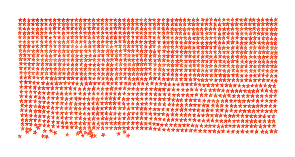 Artist’s Statement: Inspired by childhood memories of earning star stickers in kindergarten – a quiet ritual of praise and attention. Growing up in the same school where my mother once taught, I felt special and watched. Each sticker, placed on my wall, became a symbol of trying to be good.