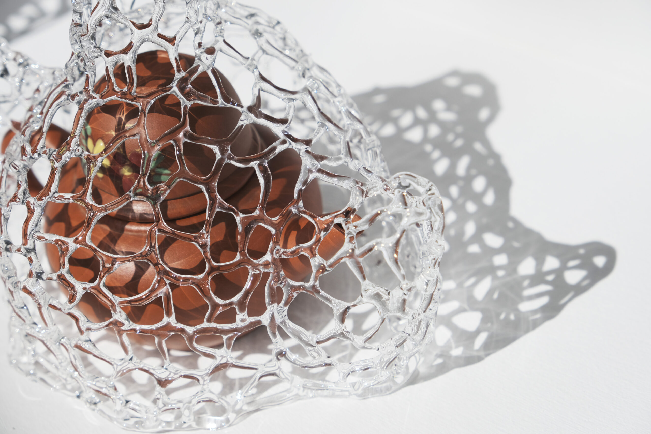 Each piece is gently encased in lampworked glass. Transparent and fragile, the glass does not seal the objects but instead reveals an intangible sense of boundary. In my practice, glass is not only a material language, but also a philosophical manifestation – it symbolizes Wu (non-being) in Daoist thought. Wu is not emptiness, but a space of undefined potential, an open and fluid mode of presence.