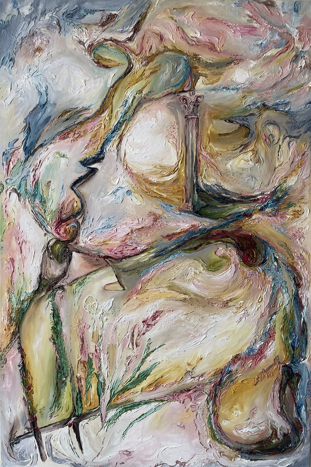 Her intuitive process begins with an act of surrender—creating compositions with her non-dominant hand, allowing subconscious forms to emerge organically. She then refines these initial gestures with oil paint, zooming in and out of details, treating each section as its own painting. Sculptural impasto brushwork blurs the boundary between two and three dimensions, creating a dynamic interplay of surface and depth.