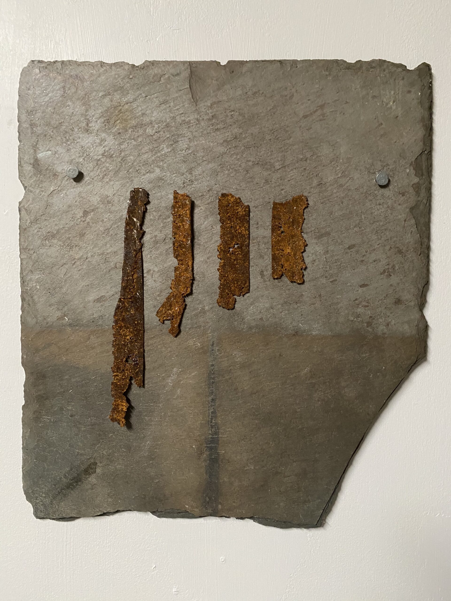 Autumn Ni Dubhghaill, Last Bloed; Olde Guarde, 2020, Rusted metal on slate, 13.5″ x 12″ (343 mm x 305 mm).