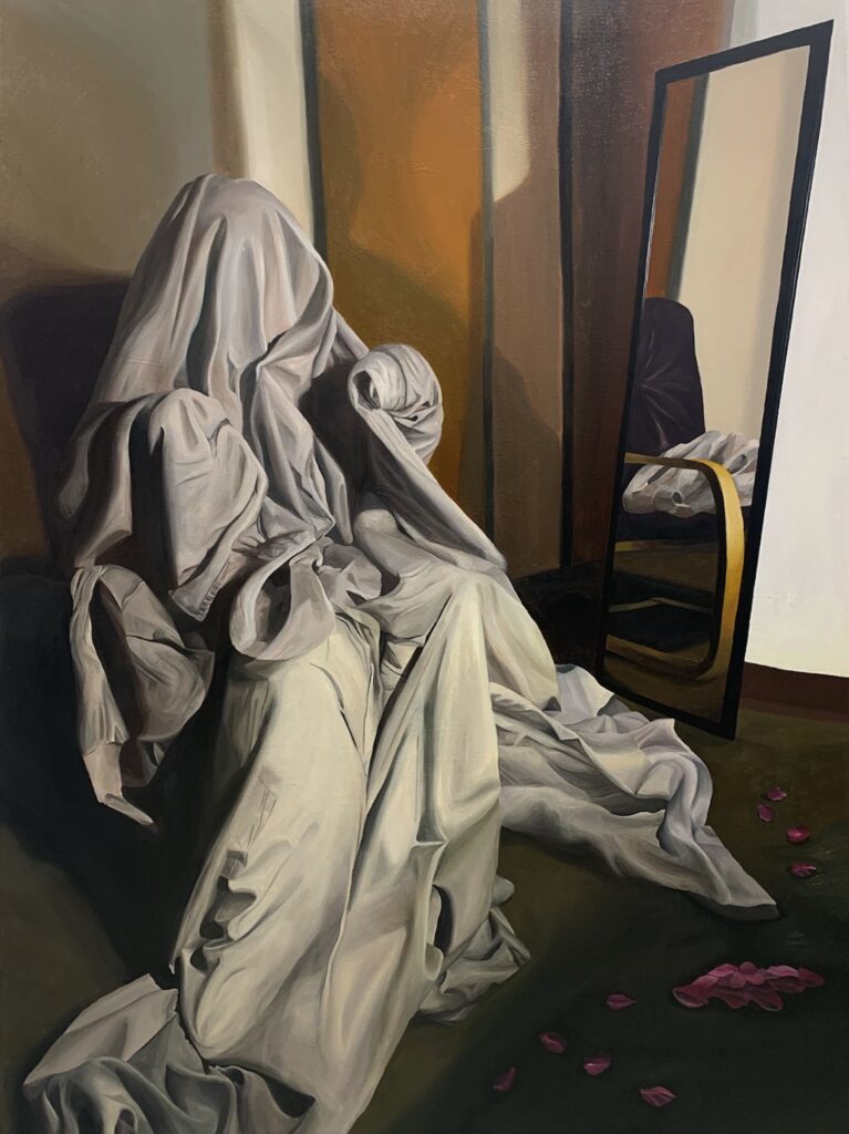 Artist’s Statement: Paris, Texas #1 uses the color pink to highlight the subject’s femininity and vulnerability, while the pink’s tone emphasizes the artificiality and inauthentic portrayal of her existence. The hue, as observed through the male gaze, creates a disconnect from her authentic self.