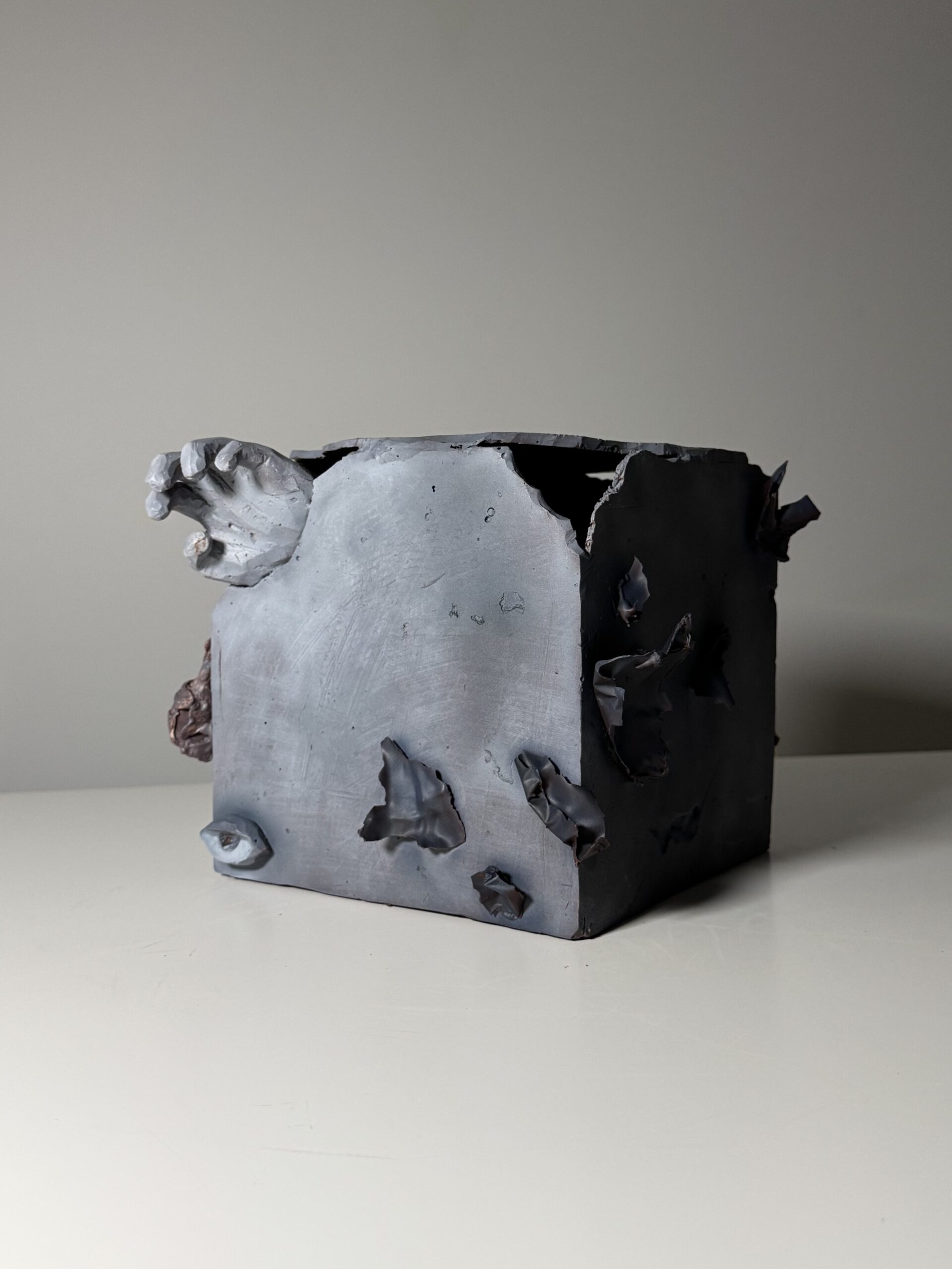 Hyunju An, The crack, 2025, Dark and milk chocolate couvertures, cacao butter, food coloring, 7.2” x 7.2” x 9.2” (185 mm x 185 mm x 235 mm).