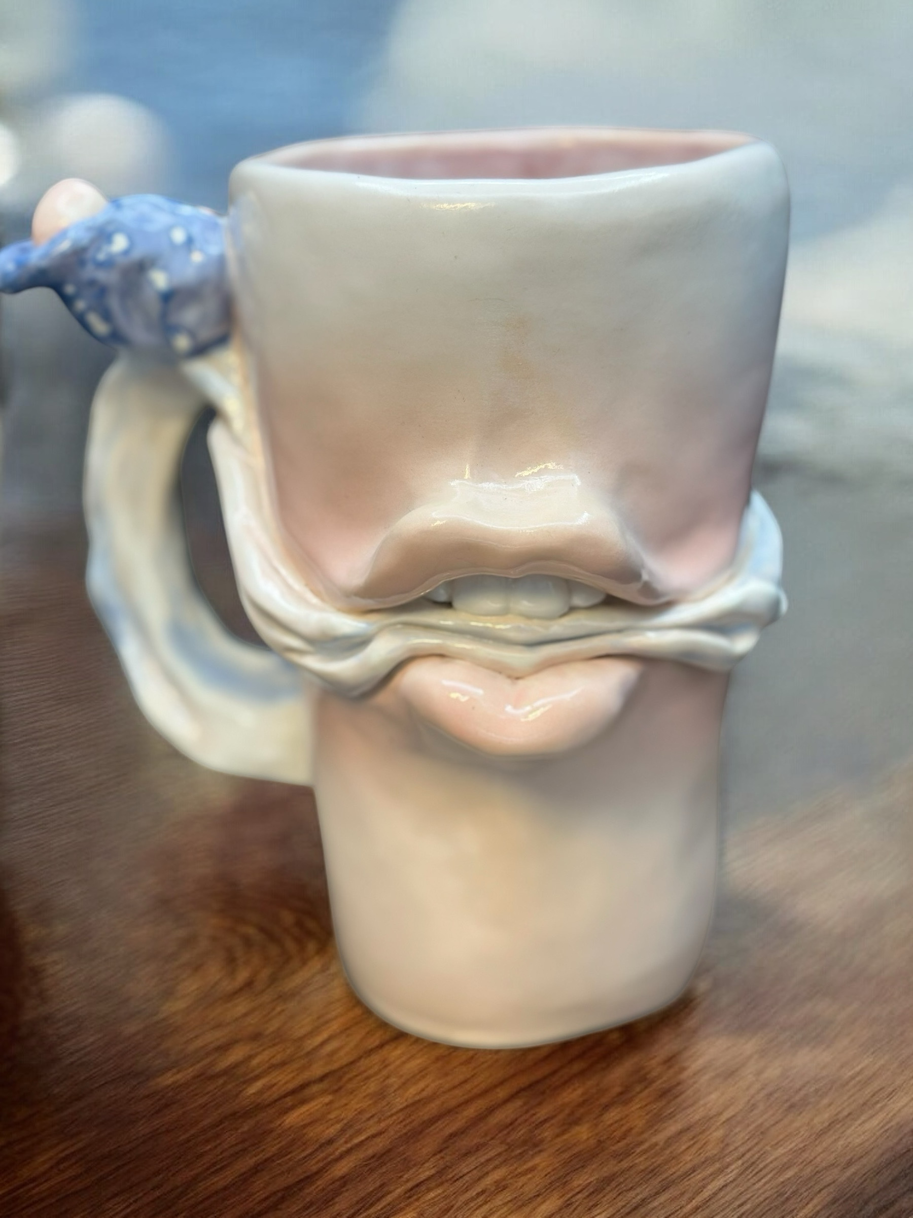 This drinking vessel stands as a powerful tribute to Margaret Sanger (1879-1966), a pivotal historical figure whose relentless activism challenged the very societal forces of silence and control that this sculpture embodies. As an activist nurse, Sanger bore witness to the devastating consequences of unrestricted fertility: young women succumbing to too many births, and children suffering from starvation in families unable to provide. In an era dominated by the oppressive Comstock Act, which criminalized the dissemination of information about birth control, Sanger courageously founded Planned Parenthood. She lobbied relentlessly, fighting for the legality and accessibility of birth control, striving to empower with the knowledge and means to control their bodies and futured, he Gagged mouth in this porcelain piece serves as a stark reminder of the era Sanger fought against a time when women’s voices regarding their reproductive health were forcibly silenced, their pleas for information and autonomy unheard, much like the very subject of birth control itself, deemed unspeakable.