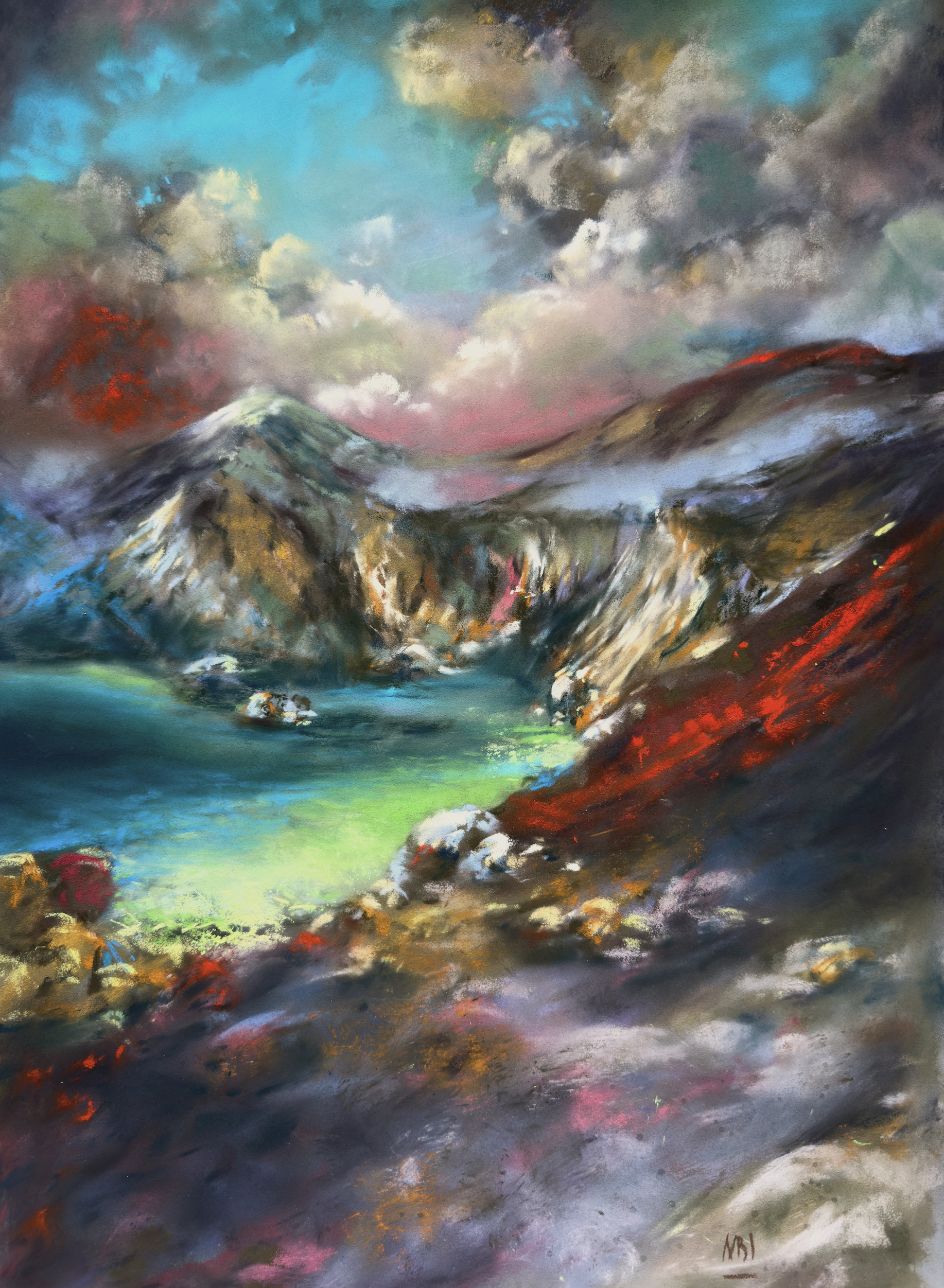 Nadia Bedei, Heart of the Volcano, 2024, Soft pastel, pastelmat, 13.8″ x 19.7″ (350 mm x 500 mm).