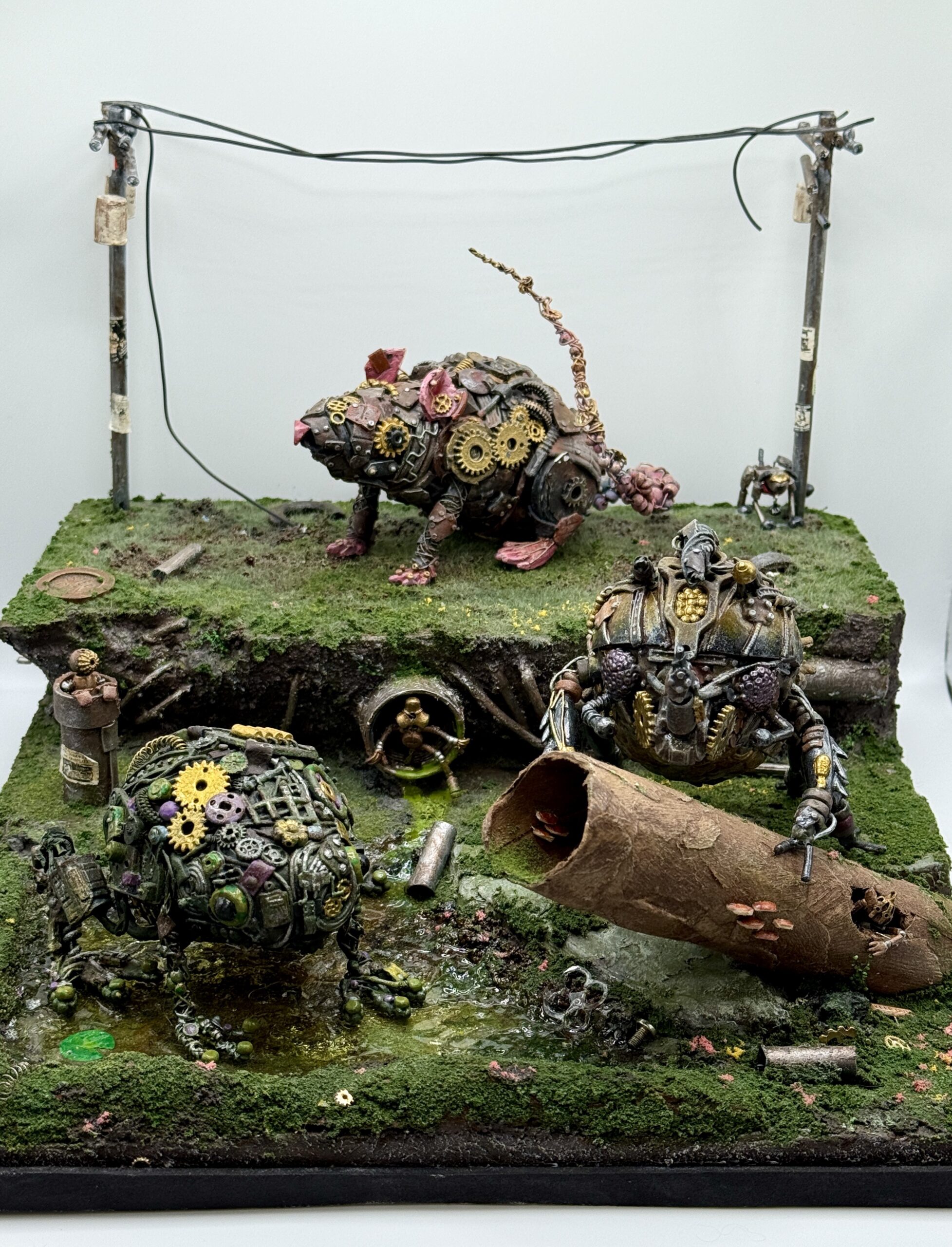 Scraplings is a miniature diorama built entirely from discarded and recycled materials. It imagines a strange, feral world where mechanical rats and frog-like creatures crawl through mossy sludge and live among trash. Each figure was sculpted from broken plastic, wire, circuit boards, and found metal, blending natural decay with human detritus. There’s playfulness and absurdity here, but also a warning: the things we leave behind, we leave behind forever. Nothing in this world biodegrades, not really. These creatures didn’t ask to inherit our garbage, but they’ve adapted to it—wearing it, surviving in it, even thriving in spite of it.