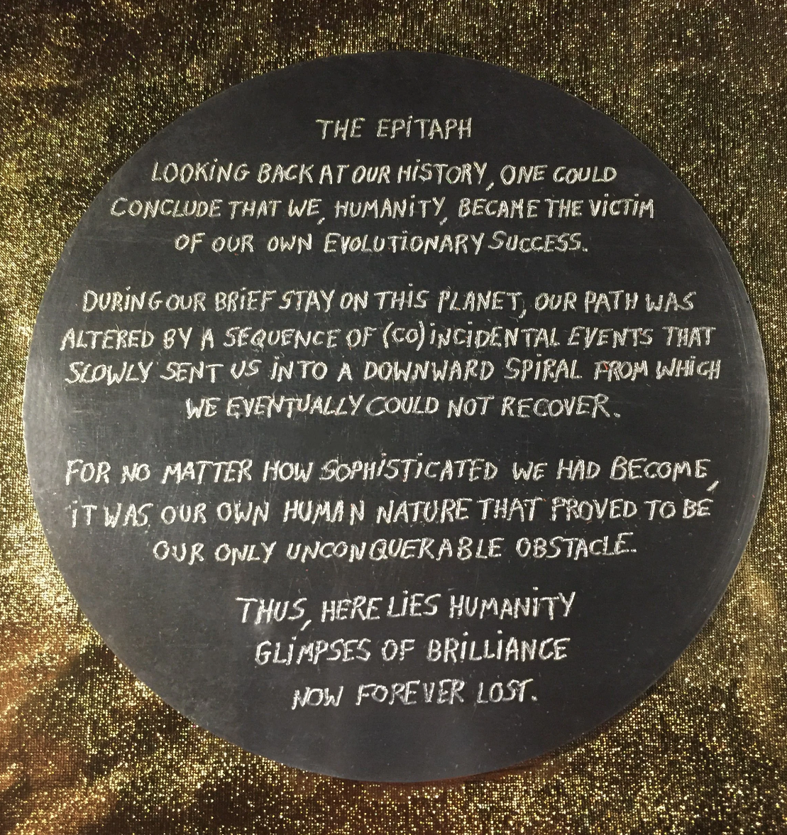 The central premise of The Epitaph is the inevitable self-destruction of humanity. While Boccanegra intentionally leaves the specifics open to interpretation, he believes that our human nature ultimately stands in the way of our survival. As intelligent animals, we are driven by self-interest, shortsightedness, and greed, characteristics that have shaped our progress but may hinder our future unless we find a way to transcend them.