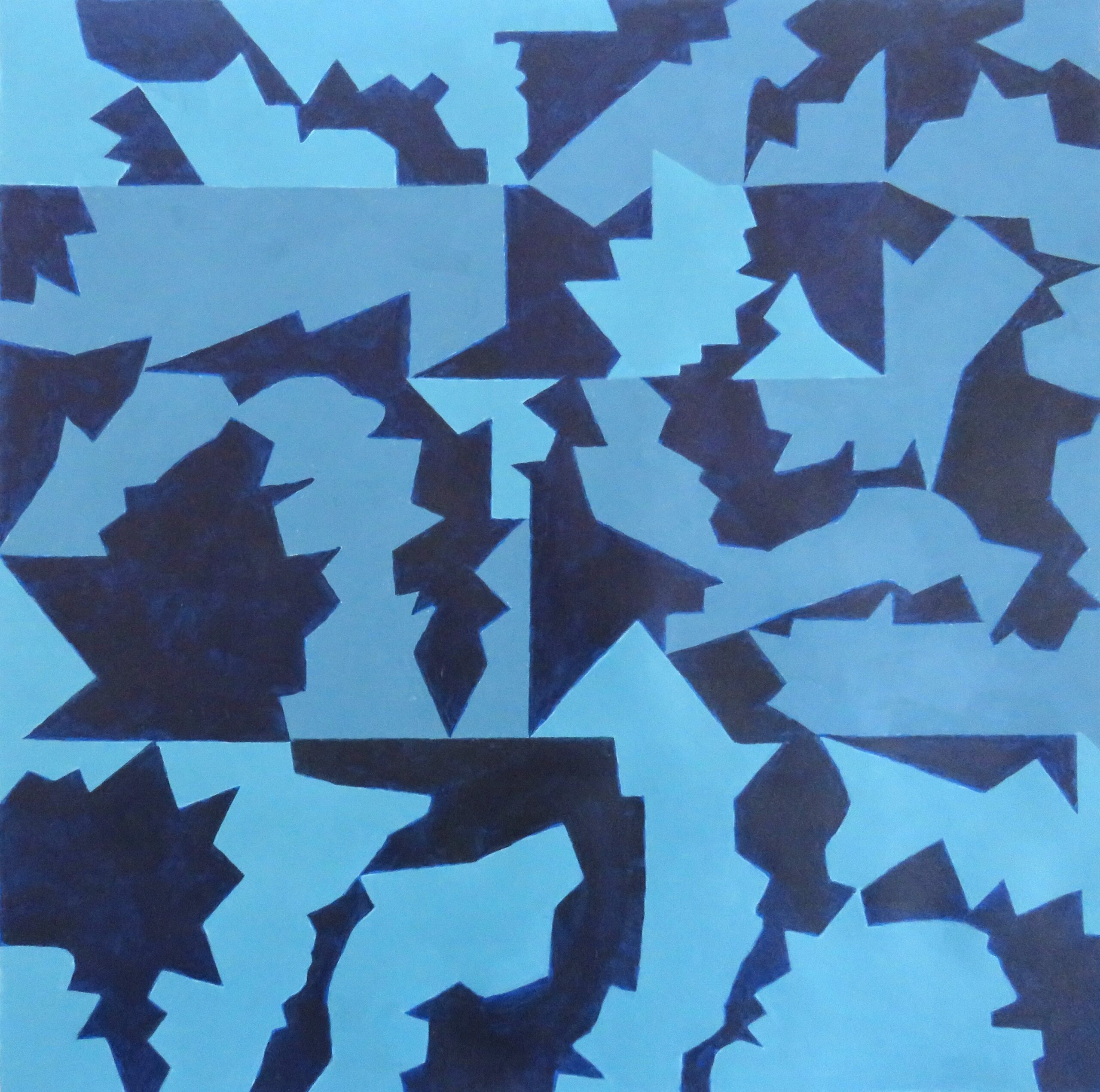 This is the fourth iteration in my Everything At Once series and explores the dynamic interplay between space and colour, striving for a poetic intensity. I have attempted to create an image that flows, without dominant focal points or visual hierarchies. Three blues with narrow tonal values, carefully proportioned 50/25/25, create a restless yet harmonious rhythm. The graphic clarity and bold contrasts between the calming blues and the energetic forms, give it a dynamic edge.