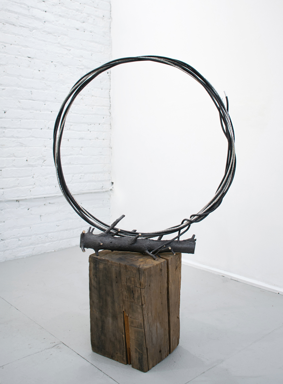 Artist’s Statement: Pine Lasso is a sculpture that intertwines themes of communication, environmental sustainability, transformation, and the complex relationship between technology and nature. By combining natural and industrial materials, this work prompts viewers to reflect on the intersections of materiality, history, and meaning. The piece speaks to contemporary concerns about environmental impact and how literal and metaphorical connectivity binds our world. It highlights the tension between preservation and transformation, challenging viewers to consider how objects, systems, and materials influence and shape our physical and conceptual realities.