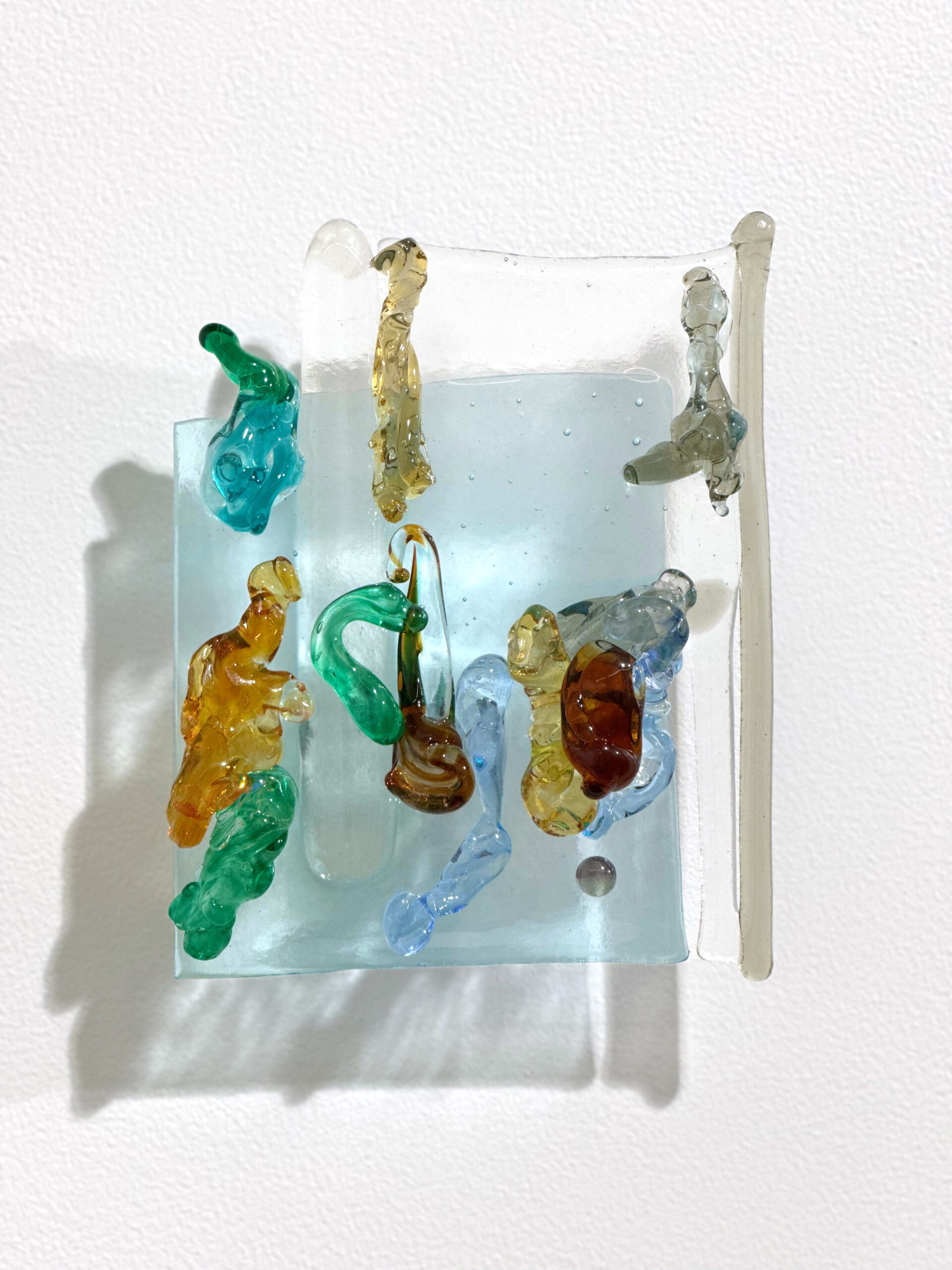 Artist’s Statement: Ice Bar is part of my Glass Painting series, supported by a 2024 Canada Council for the Arts Grant. The series utilize glass as a medium to encapsulate fleeting states of light, energy, and human emotion. Through small, intricate forms, they invite viewers into an intimate, contemplative mindscape. The works’ three-dimensional brushstrokes are aspiring objects suspended between ephemerality and permanence, metaphors for individuals navigating foreign or transitional environments. Their simultaneously intuitive and intentional gestures shimmer with an intuitive search for internal and external balances, embodying a constant negotiation between solitude and connection, stillness and transformation. The fused glass composition is a poetic embodiment of how relationships are formed, maintained, or dispersed, mirroring the intimacy and often fragility of community-building in familiar or alienated contexts.