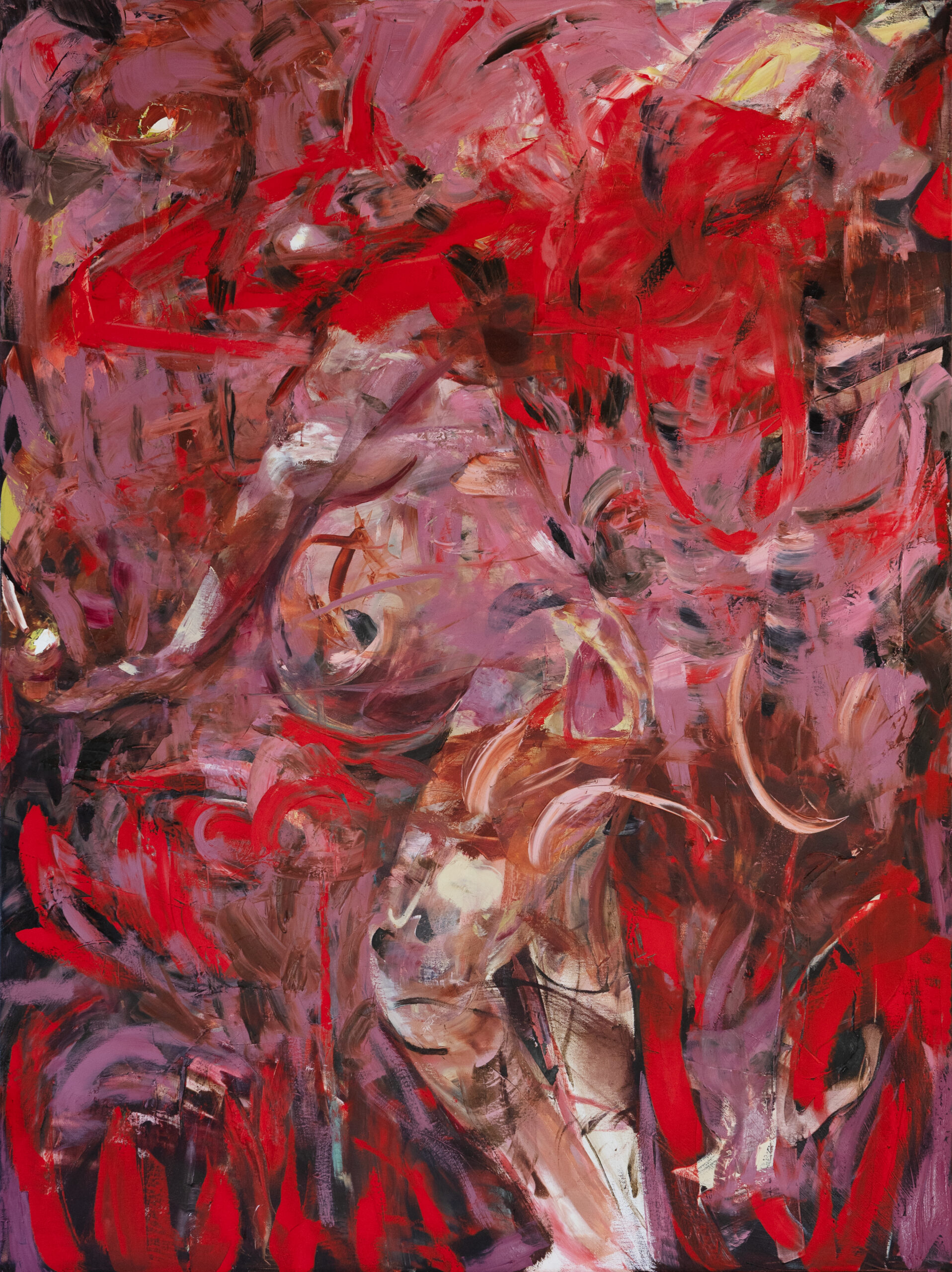 In the Belly of the Beast explores the psychological terrain of embodiment, vulnerability, and transformation. Through gestural abstraction and a saturated palette, the painting evokes a visceral interiority—a place both monstrous and maternal. Figures emerge and dissolve within the chaos, reflecting the tension between self-preservation and self-erasure.