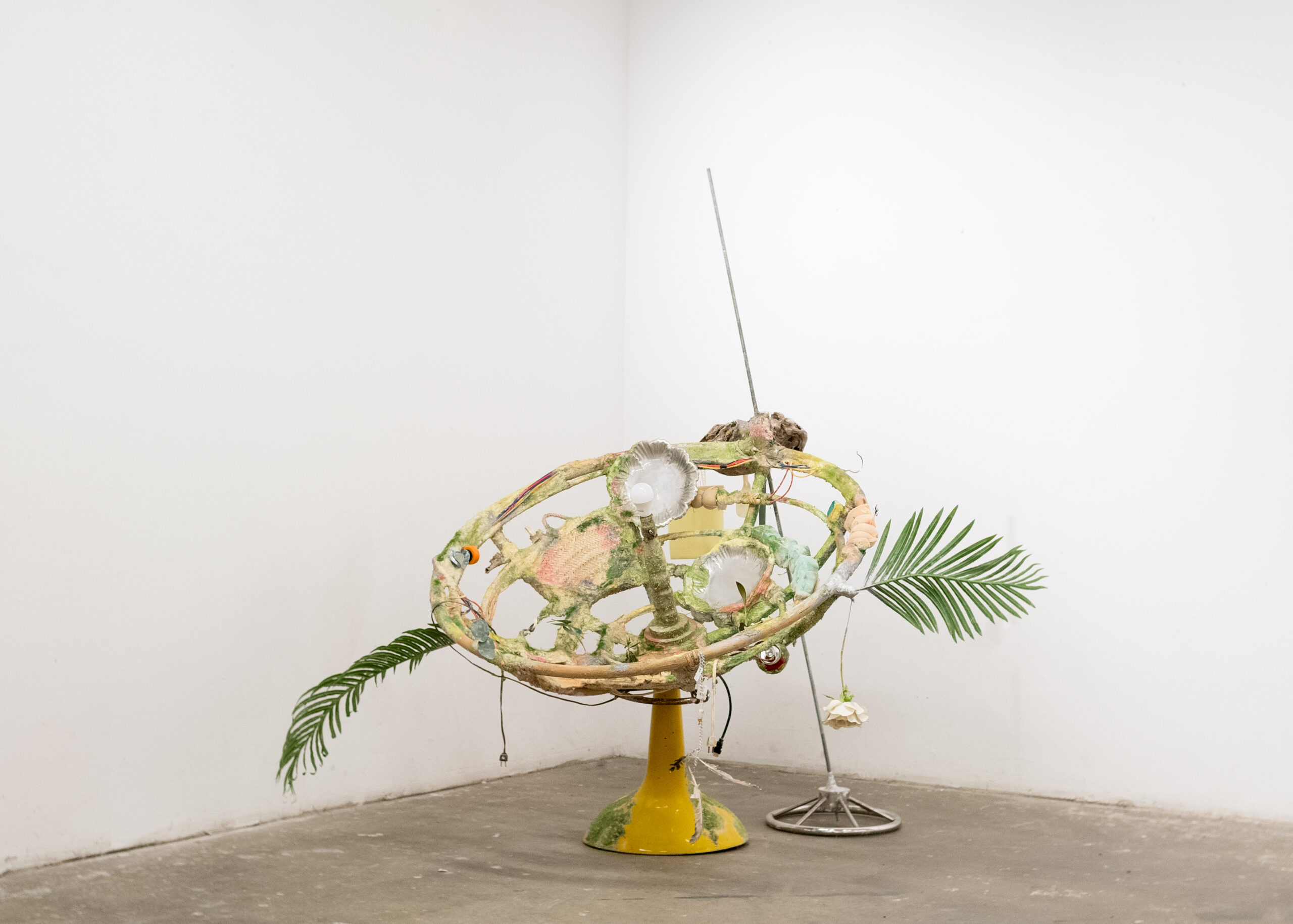 Papasan chair, bar stool, threaded rod, driftwood, back scratcher, rice paddle, Mother of Millions plant, Purple Heart plant, canteen, lab-grown crystals, silver platters, Mallorcan basket, vape, buzzball, artificial palm frond, artificial rose, artificial eucalyptus, matches, chain, pigeon feathers, bread tabs, caster, foam, steering wheel, cables, clothes hanger hook, plastic gua sha, found jaw bone, wax, debris, dust, model-making grass flock, aluminum paint, and acrylic paint