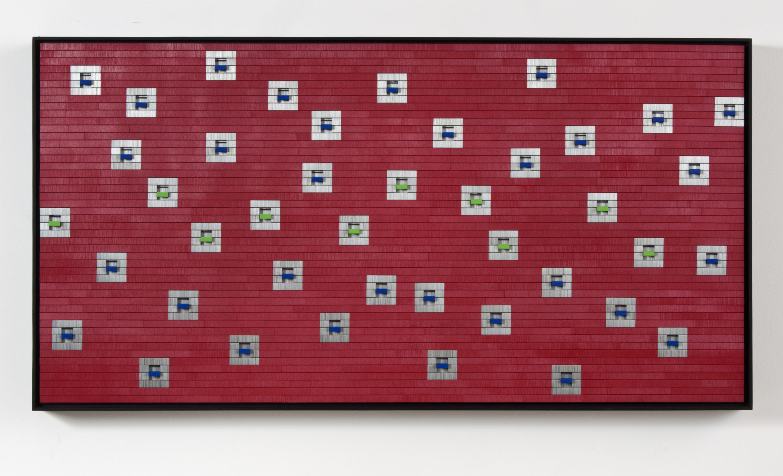 Staples, enamel, and paper clips on wood panel (framed)