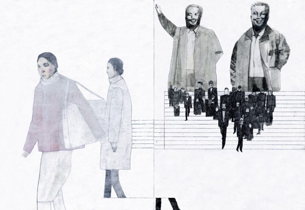 Artist’s Statement: The staircase, symbolizing the unknown, is deliberately depicted as a sketch, suggesting the malleability of history and reality. The shadowy figures, nameless and uniform, form the foundation of the authoritarian statues, representing both victims and unconscious collaborators in the power machinery. The figures on the left, though unable to change the status quo, challenge it by simply choosing to escape, maintaining a dynamic balance within the social structure. This piece conveys that true balance arises from individual resistance and questioning of power, even if it’s just one step away from conformity.