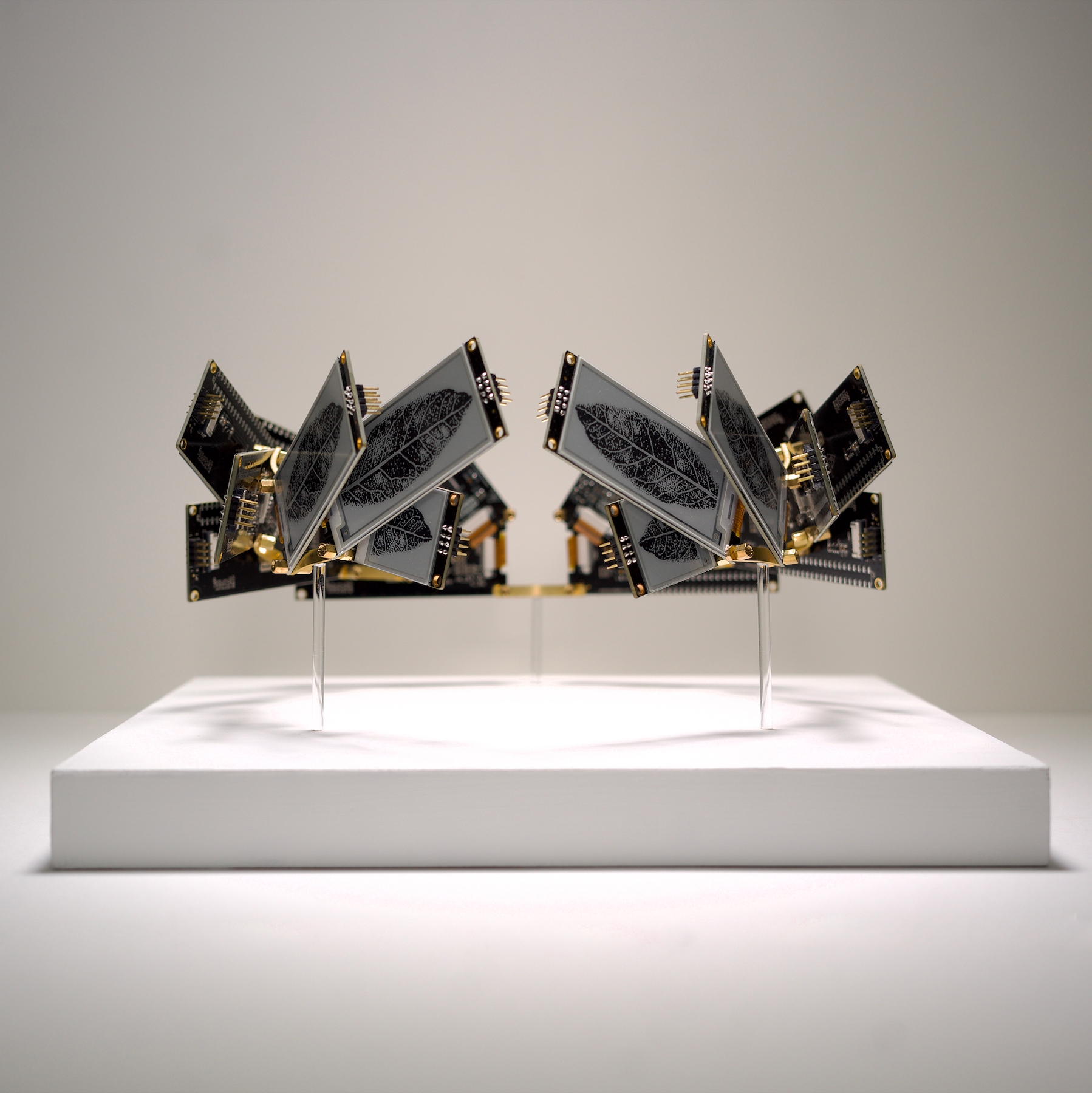 In response to this era of digital rule, I have created regalia fit for these contemporary monarchs. These crowns are crafted from electronic paper—a material that serves as both symbol and warning. In the digital realm, power is fleeting; a single update, a momentary glitch, or an algorithm change can erase entire empires. These screens can go dark at any time, leaving only an empty silhouette of authority—a stark reminder that digital power can vanish as quickly as it appeared.