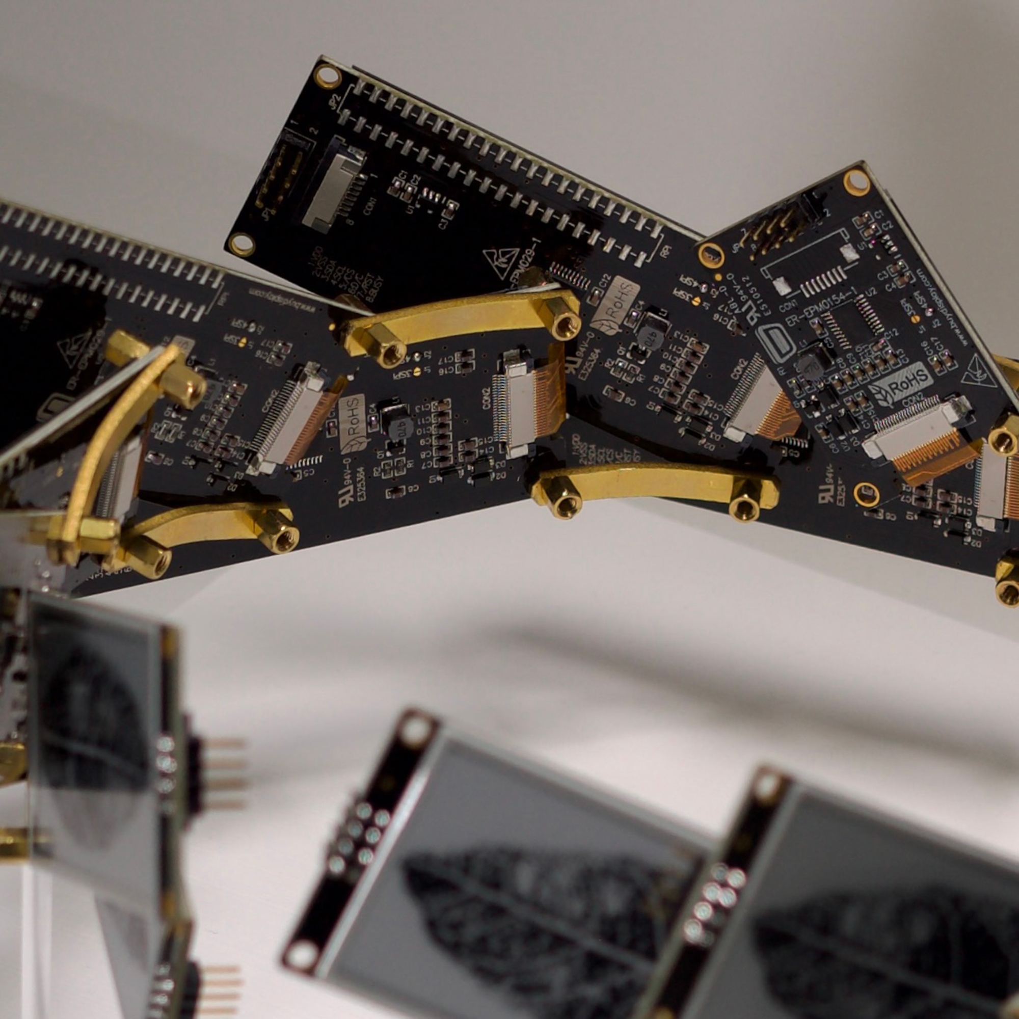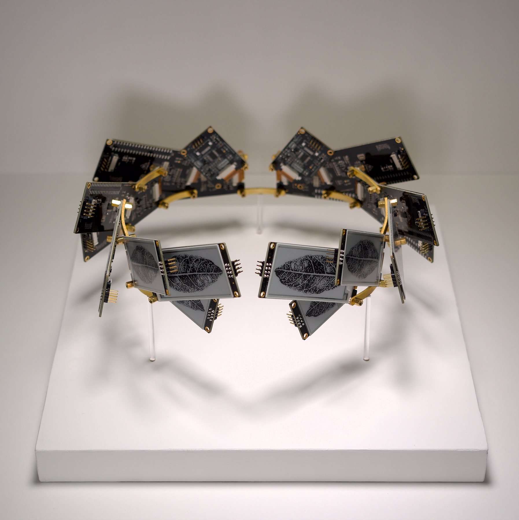 Electronic paper, PCB Board, brass, wood, and acrylic