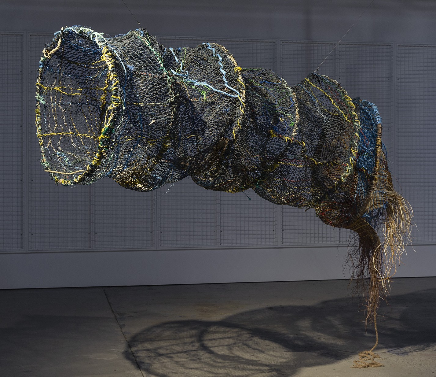 The Wilfred mob, Lharagula Ngididin (Crocodile Trap), 2023-2025, Plastic ghost nets and naturally dyed pandanus, 34.7″ x 114.2″ (880 mm x 2900 mm). Image Credit: Artbank.