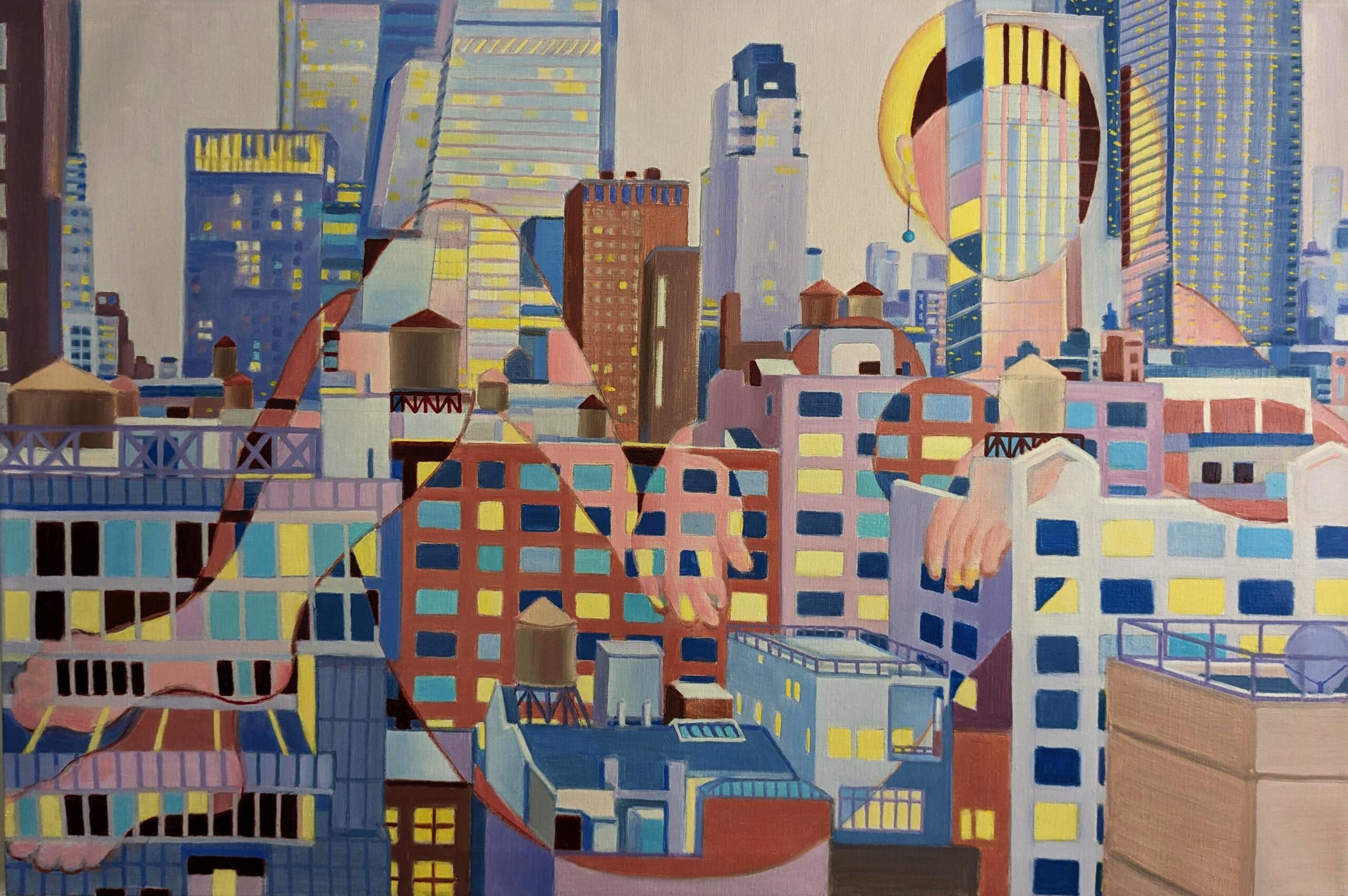Vassilina Dikidjieva, Metropolitan XI – Olympia NY, 2024, Oil on linen, 24″ x 36″ (610 mm x 914 mm).