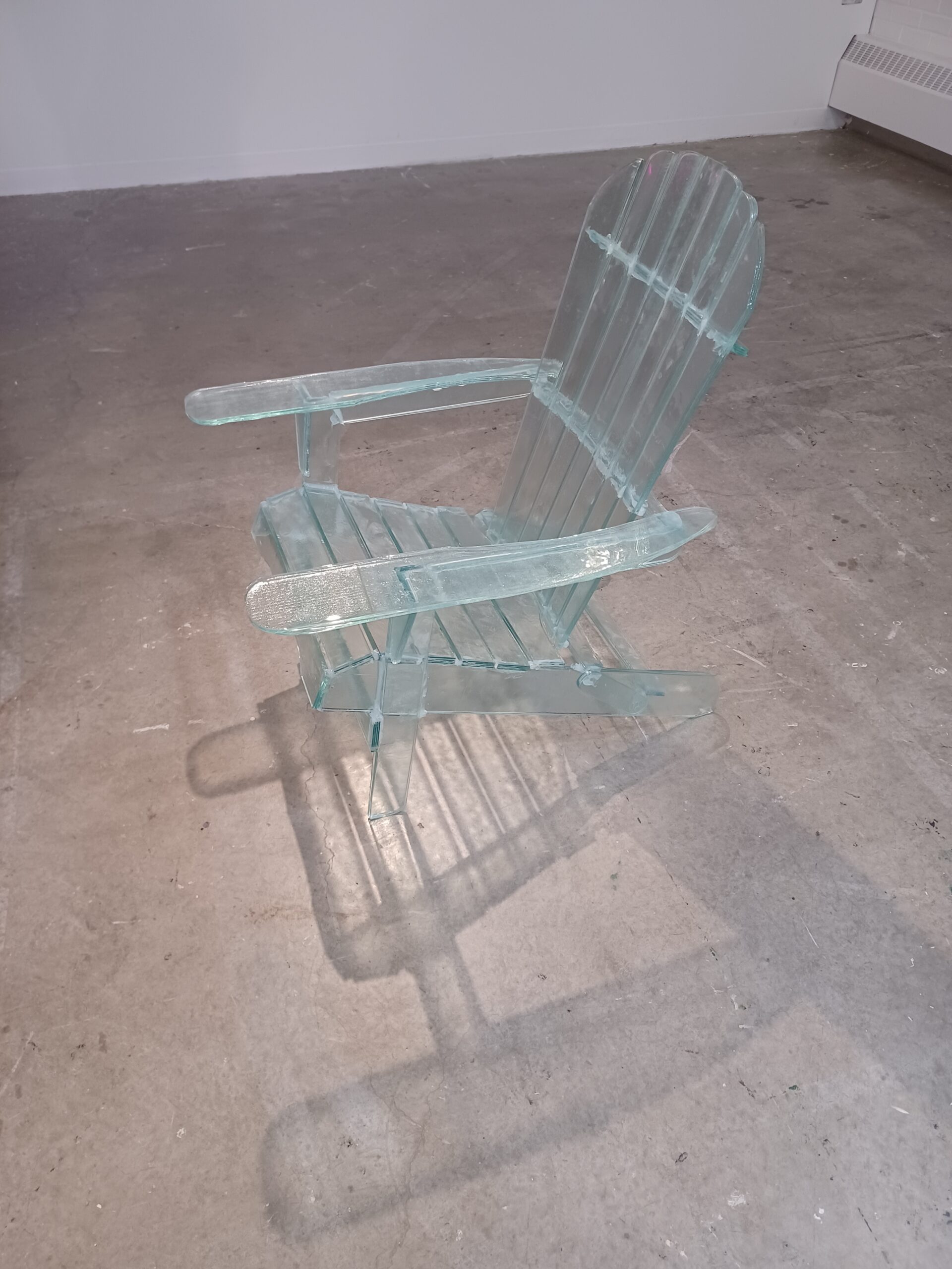 Zachary Webb, Glass Adirondack Chair, 2024, Glass, transparent caulk, 36″ x 44″ x 60″ (914 mm x 1118 mm x 1524 mm).